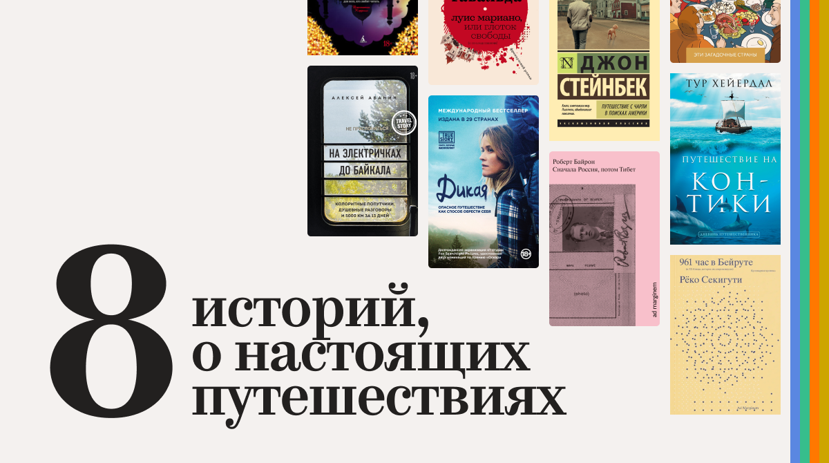 Не всегда есть возможность бросить всё и отправиться в дорогу. Но иногда, чтобы почувствовать ветер перемен и увидеть мир другими глазами, достаточно просто открыть хорошую книгу. Мы собрали 8 историй о реальных путешествиях, которые захватывают похлеще любого вымысла. Кто-то пересёк океан на плоту, кто-то проехал Россию на электричках, а кто-то искал себя, проходя тысячи километров пешком. Эти книги — о смелости, поиске и о том, что главное приключение всегда происходит внутри нас. А в конце вас ждет промокод на бесплатные 45 дней чтения! «А что, если проехать всю Россию на электричках и ночевать у случайных людей?» Эта безумная идея однажды пришла в голову журналисту Алексею Абанину. И он её осуществил — сел на электричку на Курском вокзале и отправился к Байкалу, меняя 33 поезда и ночуя у новых знакомых. Эта книга — честный и душевный репортаж о настоящей России, той, что за окном поезда, с её колоритными попутчиками и искренними разговорами о жизни. Потеряв всё — мать, брак, надежд