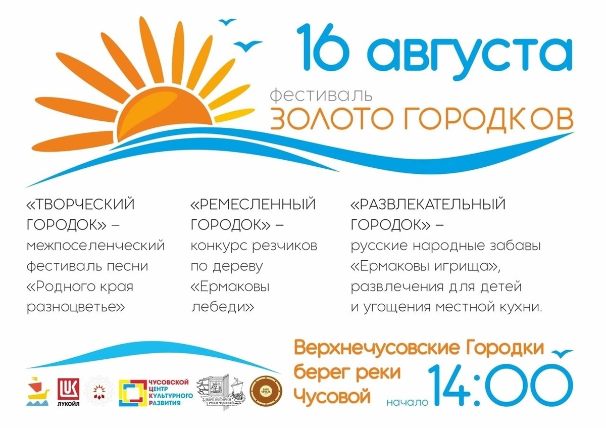 🔤🔤🔤🔤🔤🔤 Городков 🔜До самого незабываемого события этого лета остается несколько дней💥 Уже 16 августа на берегу реки Чусовой в поселке Верхнечусовские Городки с 14.00 до 19.00 пройдет Фестиваль "Золото Городков" (победитель конкурса социальных и культурных проектов ПАО "Лукойл", руководитель проекта глава Чусовского муниципального округа Сергей Белов! Программа Фестиваля насыщена и разнообразна! 💥Впервые в Чусовом конкурс резчиков по дереву «Ермаковы лебеди» - мастера в режиме реального времени создадут деревянные скульптуры, проведут мастер-классы и продемонстрируют свое мастерство по работе с деревом, презентуют свои изделия; 💥Работа трёх площадок "Ремесленный городок", "Творческий городок" и "Развлекательный городок", в рамках которых каждый найдет себе дело по душе: - мастер-классы по народным ремеслам и декоративно-прикладному искусству; - ярмарка - продажа разнообразных изделий; - работа торговых рядов; - дегустация блюд местной кухни; - русские народные забавы «Ермако