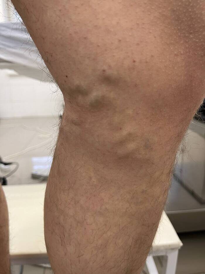 На прием обратился пациент 19 лет с жалобами на выпирающие вены и тяжесть в ногах к концу дня. Расширенные вены на ногах отмечает с 14 лет. С января 2025 года к ним добавилась тяжесть в ногах. Выполнил УЗИ: клапаны в основной вене не работают, из-за чего венозная кровь сбрасывается вниз (в норме венозная кровь течет от ног к сердцу). Чем дольше пациент живет с этой проблемой, тем большее количество изначально здоровых вен перейдет в разряд расширенных. При варикозной болезни вопрос эстетики стоит на последнем месте. Лазерная процедура выполняется по другим ключевым показаниям: Избежать увеличения количества расширенных вен и прогрессирования симптомов венозной недостаточности; Избежать формирования тромбов, так как выпирающие вены являются главным фактором риска тромбозов; Избежать кожных изменений, вплоть до трофических язв. Золотым стандартом лечения является эндовазальная лазерная коагуляция (ЭВЛК), что и было выполнено в апреле этого года. Выпирающие притоки было решено убрать с по