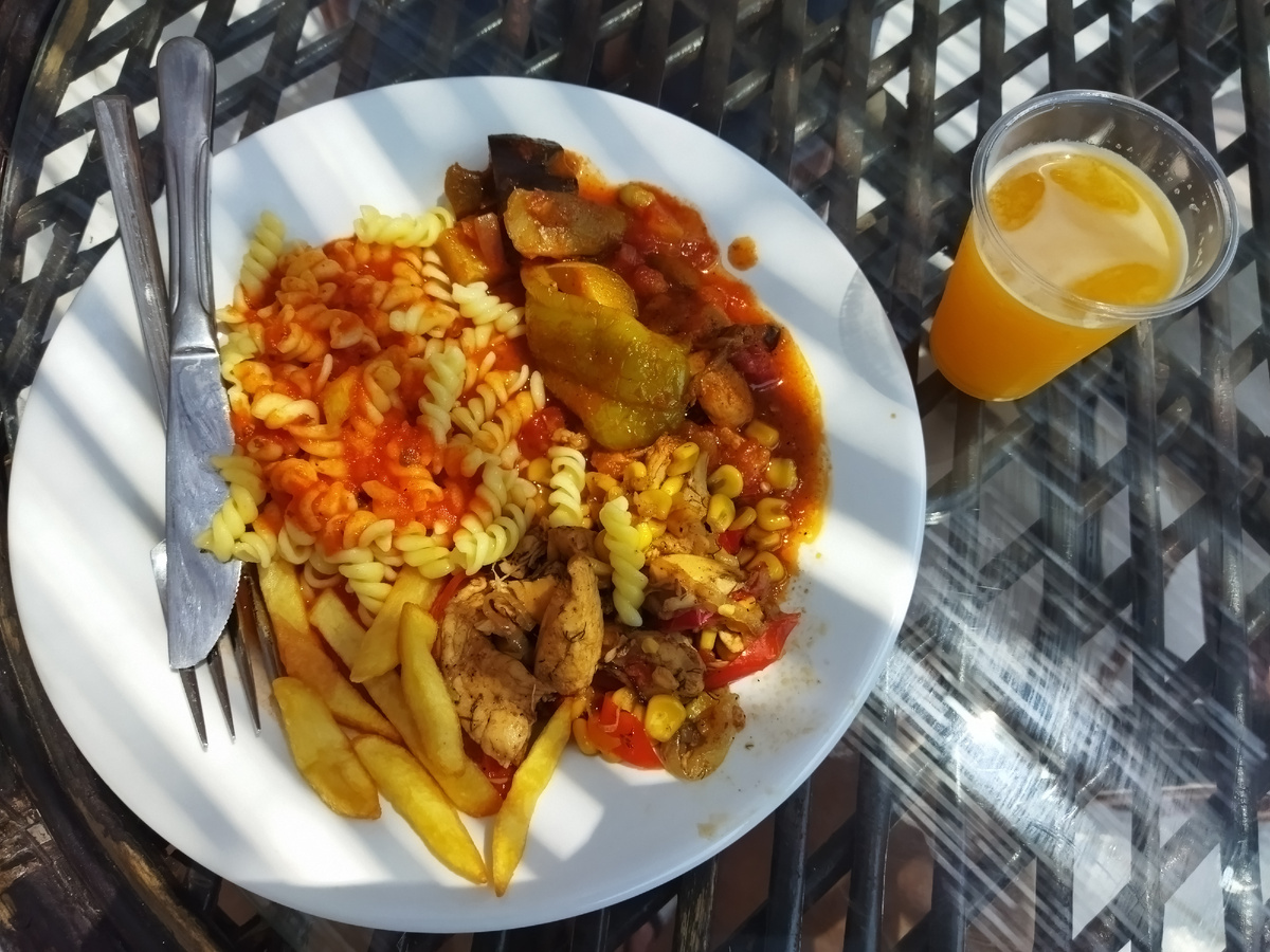 Проснулись по будильнику в 8 часов. Перед сном настроили кондиционер на 30°С и перевели в спящий режим. Якобы в этом режиме он не должен дуть постоянно, а должен только довести температуру до выбранного значения и далее включаться только раз в час, чтобы поддерживать температуру. Когда я ложился спать, кондиционер ещë дул. Утром он почти не дул. Мама сказала, что ночью было жарко, но терпимо, и, благодаря этому, балконную дверь она не открывала, что привело к отсутствию комаров. Пошли на завтрак. После завтрака на десятичасовом автобусе съездили на пляж. Лежали на лежаках под зонтами. Купались два раза. Потом съездили на обед. Вероятно, количество гостей в отеле увеличилось. В начале обеда были заняты все столы, чего раньше не случалось. Нам пришлось есть в самом дальнем углу почти у рецепции. Но к 13:15 людей стало сильно меньше, и мы пересели поближе к еде. Фотография. Еда, взятая мной на обед. Фотография. Десерт, взятый мной на обед. После обеда я пытался загрузить фотографии
