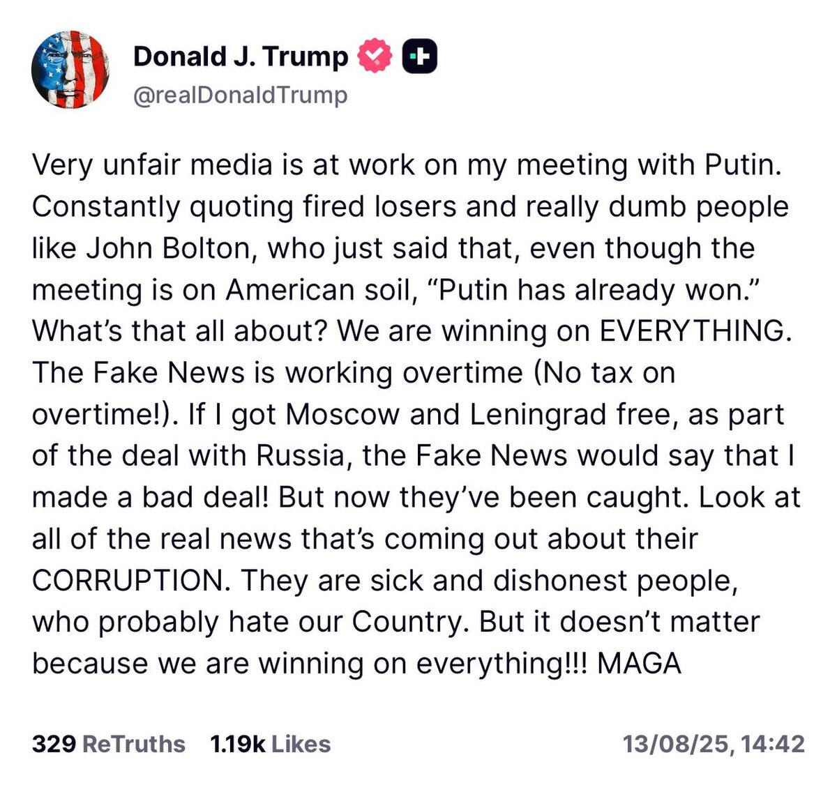 В ответ на пост 🇺🇸 Trump slams ‘very unfair’ media over his upcoming Putin meeting, mocking critics like John Bolton and blasting ‘Fake News’ for twisting any deal as a loss Claims ‘we are winning on EVERYTHING’ and calls the press ‘sick and dishonest’
