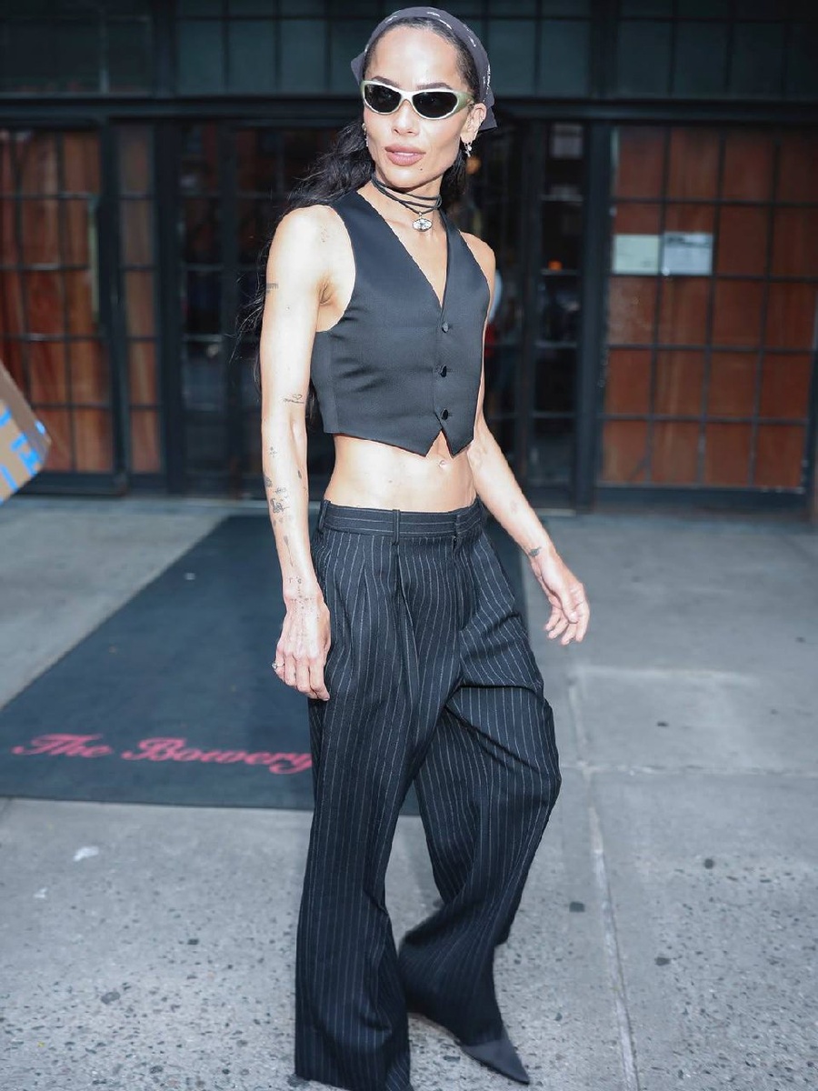 Зои Кравиц в чокере Jessica McCormack и укороченном жилете YSL появилась на шоу «Late Night with Seth Meyers