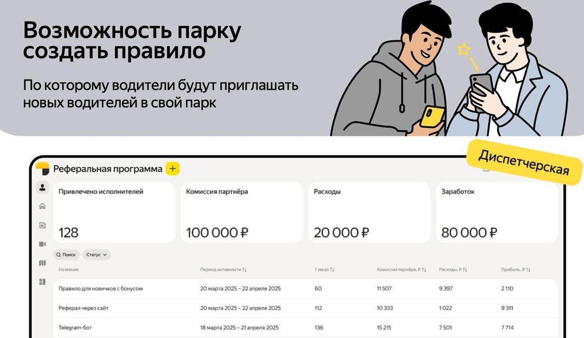 Новая реферальная программа: бонусы водителям за исполнителей Для вас и исполнителей — новая реферальная программа в Яндекс Про. Теперь водители могут по уникальному коду приглашать в ваш парк своих друзей и получать бонусы от парка. Просто настройте правила в Диспетчерской • В разделе «Исполнители» → «Реферальные правила» → «Создать реферальное правило» → значок плюса. • Задайте условия: период активности, количество дней для выполнения условий, тарифы и размер бонусов для исполнителей. • Сохраните правило. У водителей парка в приложении Яндекс Про появится код для привлечения. Важно! • При регистрации в Яндекс Про кандидат вводит код и автоматически регистрируется в парке, в который его пригласил другой водитель. • Оба исполнителя получают бонусы от парка на баланс Про при выполнении условий программы. • По одному правилу можно задать 10 ступеней бонуса. Чтобы создать правило, задайте минимум 1 ступень бонуса. Подробнее о программе [в статье](https://dzen.ru/id/65689138a0eb1c67