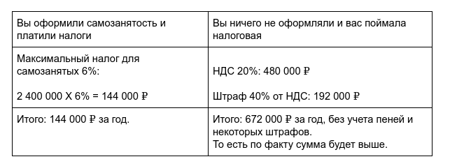 Давайте сравним, сколько вы заплатите, если оформите самозанятость и сколько, если ваш незаконный онлайн-бизнес найдет налоговая.