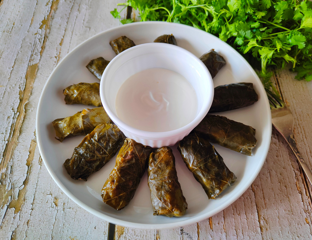 Слово "долма" (толма) на тюркских языках означает "фаршированное". Долма может быть как основным блюдом, так и горячей закуской. Существует множество вариантов этого популярного блюда. Например, привычные для нас голубцы вполне можно назвать русской долмой. Но сегодня я предлагаю насладиться божественным вкусом и ароматом классической азербайджанской долмы: - виноградные листья свежие 120 г, солёные или маринованные 250 г - фарш из баранины 350 г - рис обычный 50 г - луковица 1 средняя - кинза небольшой пучок - перец чёрный молотый - соль по необходимости - приправы по желанию (у меня молотый кориандр и острый красный перец) Для подачи - - мацони 2 ст.ложки с горкой (катык, густой кефир) + чеснок 1/3 крупного зубчика Если у вас свежие виноградные листья, залейте их кипятком на 40 минут. Солёные листья нужно промыть холодной водой. У меня маринованные, и я с ними ничего предварительно не делаю. Рис заливаем кипятком, сливаем, промываем в холодной воде, после чего добавляем в фар