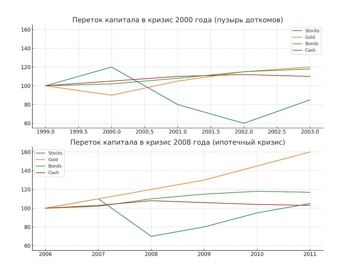 Когда циклы сходятся: куда утекают деньги после пика Вижу по вашим реакциям, что тема актуальна, продолжаем разбираться. В любой пузырь важнее не момент «лопнуло», а то, куда бежит капитал, когда эйфория заканчивается. История даёт почти идентичный сценарий. В конце цикла цены на перегретых рынках выглядят «вечными». В 2007 американская недвижимость «никогда не падала», в 2000 интернет-компании «навсегда меняли мир», в 1972 акции «не имели потолка». Но как только начинается охлаждение, деньги текут туда, где можно пересидеть шторм. Классическая цепочка выглядит так: — Перегретые активы (акции, недвижка, крипта) → в кэш или краткосрочные облигации; — Затем — в защитные инструменты: золото, валюты-убежища (USD); — Только те, у кого осталась ликвидность, через 1–3 года начинают скупку на дне. Почему это важно инвесторам в крипте? Потому что в 2026, если сходятся прогнозы по недвижимости, фондовому рынку и биткойн-циклу, крипта окажется в одной лодке с акциями — под давлением распр