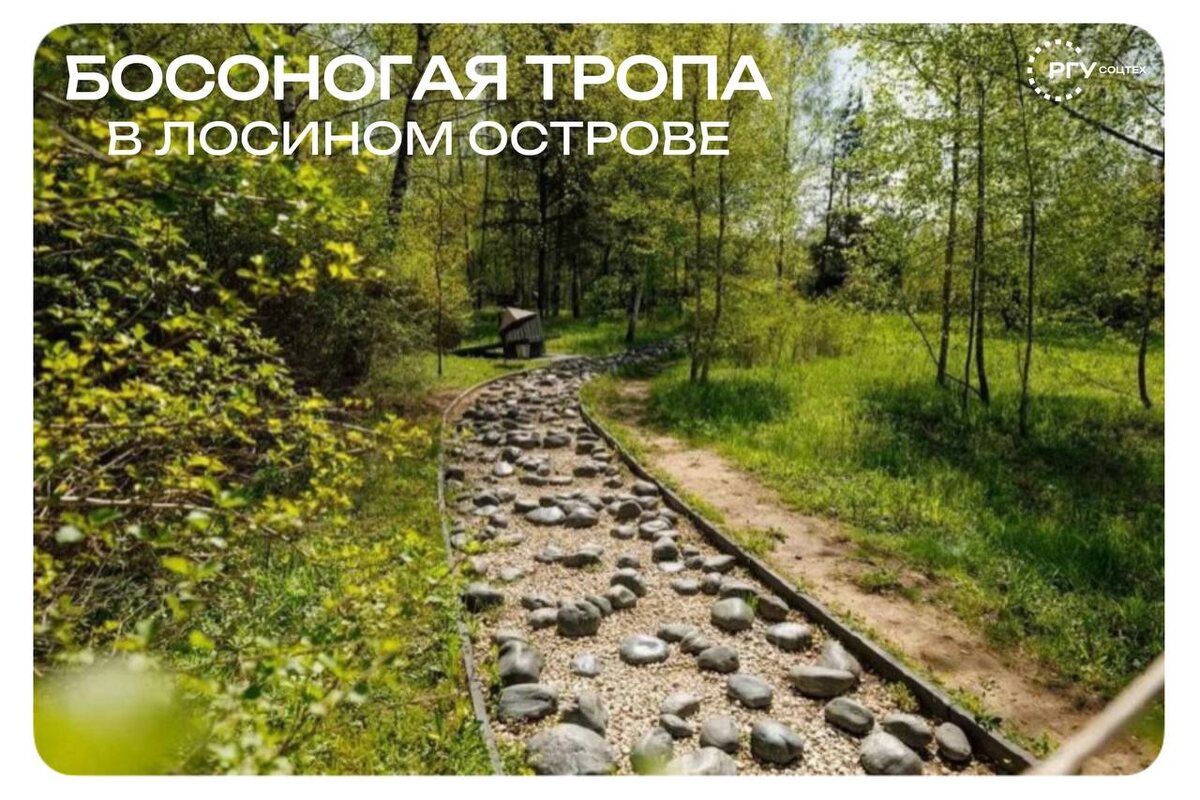 😘 Вернись в детство! Рядом с РГУ СоцТех есть место, где можно отдохнуть от суеты и буквально почувствовать землю под ногами. На Босоногой тропе в Лосином острове вы снимаете обувь и проходите по разным природным покрытиям: гладким камушкам, мягкому песку, еловым шишкам. Здесь можно: ▶️пройти природный массаж для стоп, ▶️насладиться ароматами леса и ромашковых полян, ▶️послушать пение птиц и жужжание стрекоз, ▶️наполниться энергией и свежими впечатлениями. Такой отдых не только поднимает настроение, но и помогает восстановить силы для учебы и новых проектов 👍 @rgusocteh #соцтех_на_лосинке