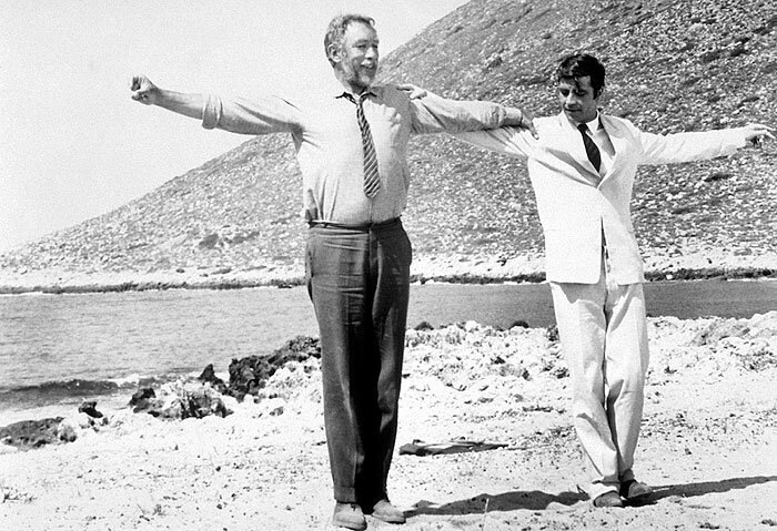 Сценарий К сожалению, у меня нет возможности оценить, насколько экранизация соответствует оригинальному тексту, поскольку книгу я пока не читал. Поэтому в этом разделе оценка будет касаться лишь сюжетной составляющей. Как уже было отмечено выше, во время просмотра может сложиться впечатление, что ты не понимаешь, а что ты смотришь, потому что на экране происходит цепочка, казалось бы, не связанных друг с другом событий. В самом начале фильм главный герой Бэзил ждет отправку парома к Криту, но из-за разыгравшегося шторма вынужден ожидать рейса на речном вокзале, где собственно происходит знакомство с Зорбой. Поначалу могло бы показаться, что Зорба – это какой-то мошенник-проходимец, но Бэзилу словно всё равно, ибо он – писатель, у него творческий кризис, и ему нужна какая-то разрядка, которая вернет его к привычной жизни. И вот герой соглашается на предложение Зорбы, чтобы тот стал ег партнером в проекте возобновления работ в шахте, которая досталась Бэзилу вместе с небольшим участком земли от отца-грека. Вот герои поселяются в греческой деревне на острове Крит. Вот они знакомятся с мадам Гортензией, немолодой француженкой, вынужденно живущей в этом месте уже много лет и мечтающей встретить принца, роль которого на себя берет страстный Зорба, что приводит к трагическим последствиям. Вот Бэзил влюбляется в местную крестьянку молодую вдову, которую вожделеет вся мужская половина деревни, но которая отвечает взаимностью только Бэзилу, что приводит к своим трагическим событиям. Вот герои предпринимают попытки возобновить работу угольной шахты. И всё это реальный набор событий, которые, словно куски разноцветных тканей, в итоге составляют целое покрывало и какой-то сюжет. Из-за такой необычной структуры и системы построения сюжета зрителю будет сложно уловить общую канву, но в этом фишка фильма – он заставляет думать.