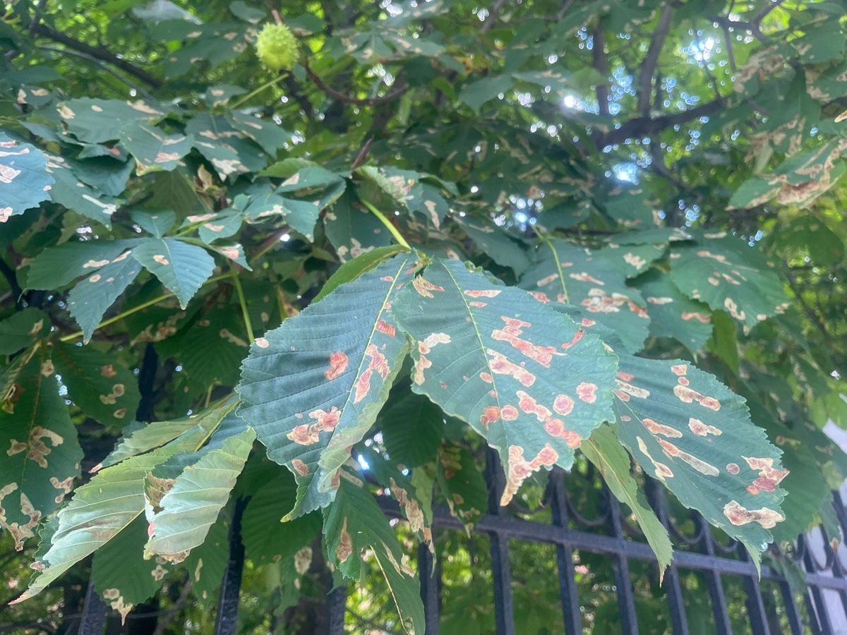В Курске минирующая моль продолжает поражать каштаны. На листьях вновь появились желтые пятна. Затронуты и плоды. Всё это влияет не только на внешний вид деревьев, но и на их здоровье, существенно его подтачивая.
