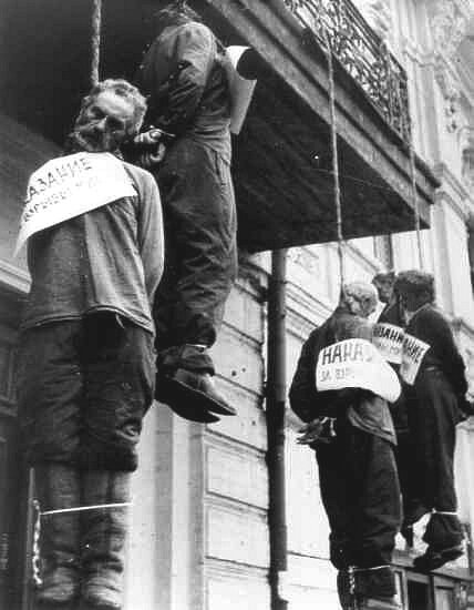 Уже на второй день после прихода немцев они под предлогом борьбы с партизанами схватили и повесили на балконах фасадов зданий центральных улиц и площадей 116 харьковчан и запретили снимать их тела.
