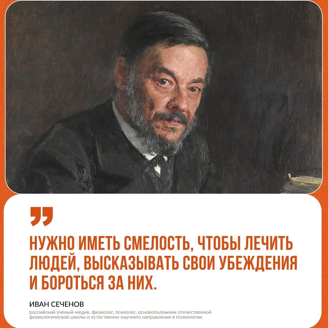 ☝️ Сегодня день рождения «отца» русской физиологии Ивана Сеченова Именно он создал первую русскую школу физиологии – науки о том, как функционирует человеческое тело. Делимся еще любопытными фактами об ученом: 🔹 не сразу выбрал медицину: сначала поступил в Главное инженерное училище Санкт-Петербурга, затем отправился на военную службу. В 1850 году он вышел в отставку, спустя год – поступил вольнослушателем на медицинский факультет Московского университета 🔹 предложил ввести 8-часовой рабочий день 🔹 ему принадлежит высказывание о том, что «лучший отдых – это смена деятельности», а не полный покой 🔹 был активным сторонником развития женского образования 🔹 выдвинул первую в отечественной науке программу построения психологии как самостоятельной науки 📖В карточке делимся его яркой цитатой. Ставьте лайк, если как админ тоже вдохновляетесь жизнью и трудом Ивана Михайловича! #здоровье_96