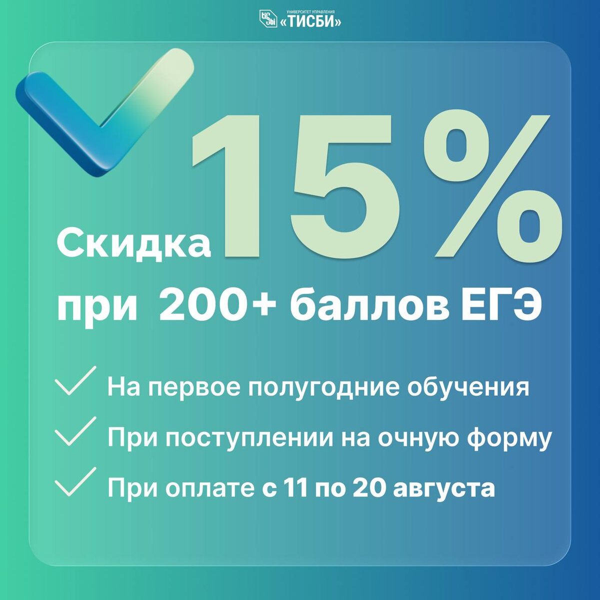 🔖Учеба мечты становится ближе! Для всех абитуриентов Университета управления «ТИСБИ», набравших 200+ баллов ЕГЭ, мы подготовили приятный сюрприз! Установлена скидка 15% на стоимость первого полугодия обучения при поступлении на очное отделение и оплате с 11 по 20 августа 2025 г. включительно. Приемная комиссия: ул. Муштари, 13 +7 (800) 600-23-19 +7 (843) 294-83-25 Узнать подробнее Это твой шанс начать путь к знаниям с выгодой и уверенностью в будущем!
