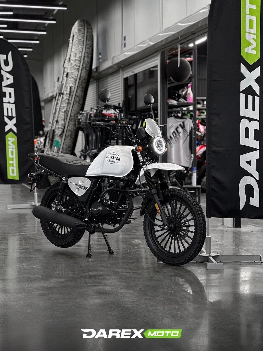 🏍️ Regulmoto Monster — дорожный мотоцикл с ПТС Что это за мотоцикл? 🔵Класс «классик» — прямой руль, удобная посадка, ретро-внешний вид. 🔵Двигатель 200 см³, 15 л.с., 4-тактный, 1 цилиндр — простой и надёжный «рабочий конь» для города и загорода. 🔵С ПТС — можно легально ездить по дорогам общего пользования (нужны права соответствующей категории). Что внутри? 🔸5-ступенчатая механика (схема 1-N-2-3-4-5) — передачи короткие и понятные, тянет с низов. 🔸Карбюратор + зажигание CDI — меньше «электронной магии», легче обслуживать. 🔸 Запуск с кнопки + кик-стартер — если сел аккумулятор, заводишь «с ноги» и поехал. Комфорт и контроль 🔵Подвеска: телескопическая вилка спереди и 2 задних газовых амортизатора Nitrogen (ход 65 мм) — сглаживают ямы и стыки. 🔵Тормоза: барабанные спереди и сзади — простые и неприхотливые. 🔵Колёса 17/17 — устойчивость и предсказуемость в поворотах. 🔵 Вес 118 кг — манёвренный, не тяжёлый в городском трафике. Для кого? 🔸 Первый мотоцикл. Максимум простоты