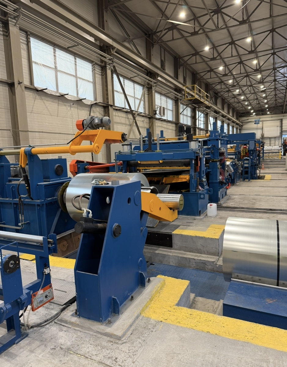 Линия поперечной резки (ЛПР) листовой стали — это автоматизированный комплекс оборудования, предназначенный для поперечной нарезки металлических рулонов на заготовки заданных размеров. Такие линии широко используются в металлообработке, автомобилестроении, судостроении и других отраслях промышленности. 1. Разматыватель (размотчик) – подает металлический рулон в линию. 2. Петлеобразователь — обеспечивает плавную подачу листа в правильную машину. 3. Правильная машина (правилка) – устраняет деформации и неровности листа после размотки. 4. Поперечные ножницы – режет лист на заготовки нужной длины. 5. Транспортная система (роликовые конвейеры, укладчики) – перемещает и укладывает готовые листы. 6. Система управления (ЧПУ, датчики) – обеспечивает точность резки и автоматизацию процесса. Рассмотрим перечисленные компоненты на примере ЛПР, используемой на Лобненском металлопрокатном заводе. Разматыватель – это узел ЛПР, предназначенный для равномерной подачи металлического рулона в процесс о