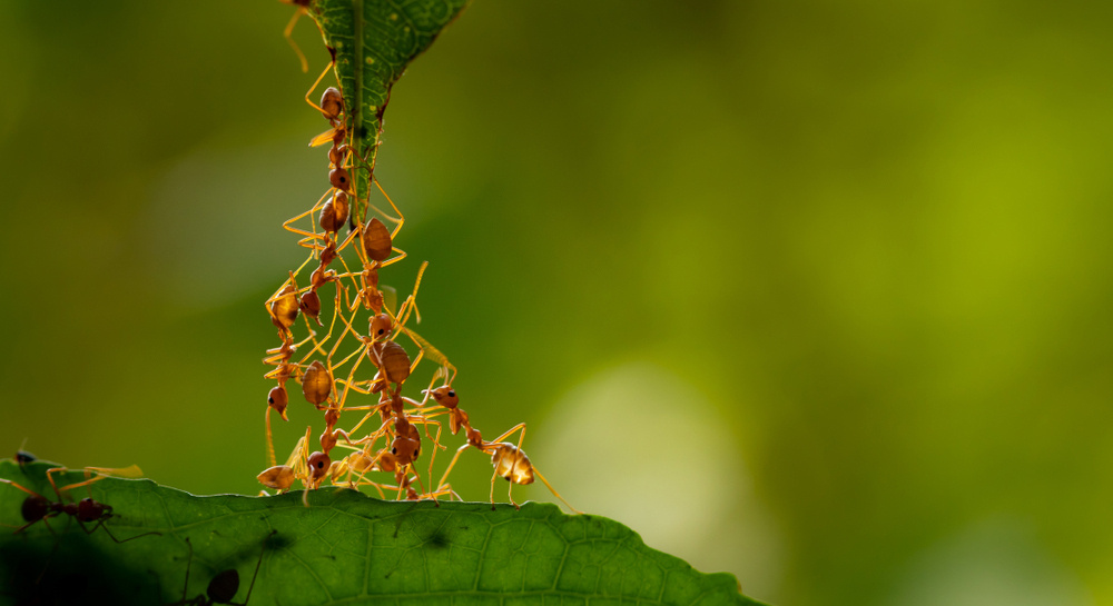 Крошечные древесные муравьи Oecophylla smaragdina, обитающие в тропиках Африки, Азии и Австралии, известны эффективным коллективным трудом при строительстве гнезд: они образуют живые цепочки, чтобы сворачивать листья и склеивать их шелком, выделяемым личинками.