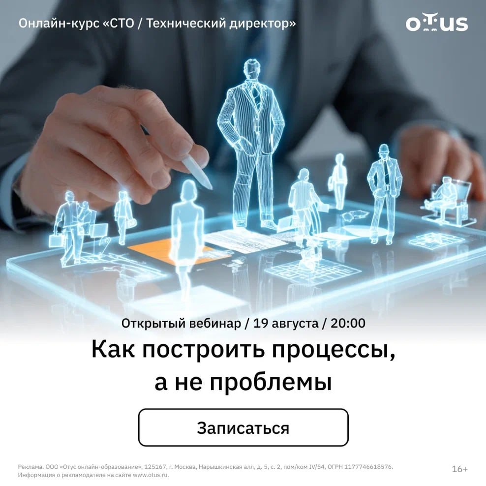 ⁉️ Устали от хаоса и неопределенности в управлении командами? Узнайте, как превратить проблемы в четко управляемые процессы. Присоединяйтесь к открытому вебинару «Как построить процессы, а не проблемы» 19 августа в 20:00 МСК. На уроке вы: - Узнаете, как выявлять и анализировать проблемы, превращая их в эффективные процессы. - Разберетесь, как управлять процессами с помощью делегирования и автоматизации. - Поймете, как внедрять изменения, не теряя команду, и снижать сопротивление. Этот вебинар — отличная подготовка к курсу «CTO / Технический директор», который стартует совсем скоро. Все участники вебинара получат скидку на обучение. Присоединяйтесь и прокачайте навыки эффективного управления процессами с OTUS! Записаться на вебинар → https://otus.pw/cmkX/ Реклама. ООО «Отус онлайн-образование», ОГРН 1177746618576