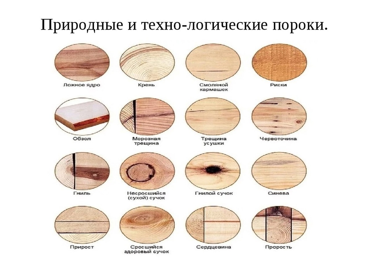Могут появиться как при жизни дерева (из-за морозов или ветра), так и после спила — при неправильной сушке. Бывают: Сучки