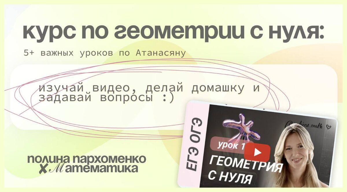 📌⭐️БЕСПЛАТНЫЙ МИНИ-КУРС ПО ГЕОМЕТРИИ Готовиться будем по учебнику Атанасян ☺️ - наш любимый и самый популярный учебник в школах! С этими уроками можно начать путь в мир геометрии, а также изучить мой стиль преподавания 📘 5 уроков + 🎯 разбираем то что будет на экзаменах ЕГЭ/ОГЭ 🧠 Теория, практика и порядок в голове. 🔖 Для 8–11 классов, репетиторов, самостоятельных бойцов. 🖥 Получить и скачать бесплатно → https://t.me/poleinehelp_bot?start=s=3358405-utm_medium=telegram