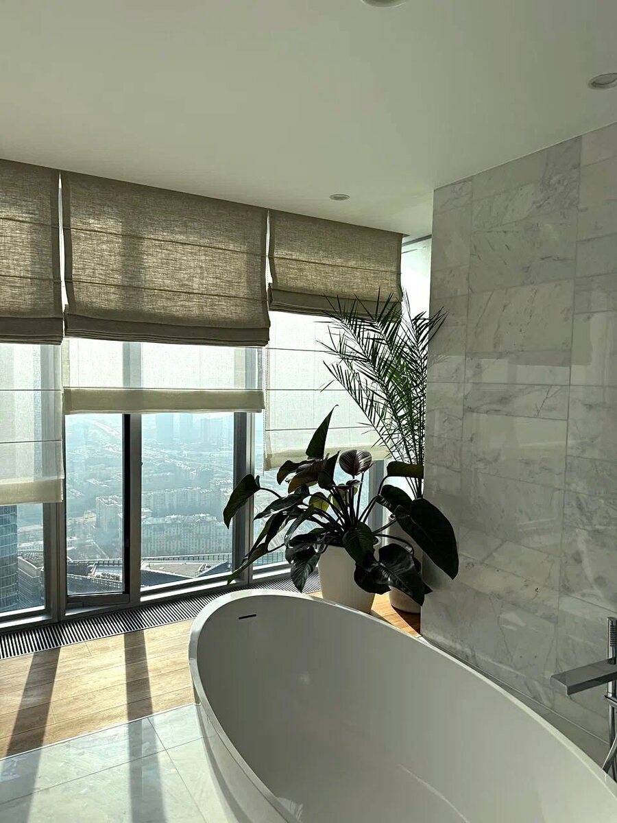 Есть интерьеры, в которых хочется задержаться. Не потому что они «красивые» в привычном понимании, а потому что в них ощущается баланс — между светом и тенью, приватностью и открытостью, теплом и прохладой. Сегодня мы заглянем в мастер-спальню и мастер-санузел проекта в Башне ОКО — пространство, где каждое решение выверено до миллиметра. Панорамный вид, который диктует правила Когда перед тобой открывается панорама города, легко потеряться в вау-эффекте и забыть об уюте. Но комфорт — это то, что остаётся, когда первая эмоция проходит. В этом проекте мы искали баланс: сохранить открытость вида и при этом дать хозяевам возможность закрыться от внешнего мира. Решение для мастер - санузла — двойные римские шторы: плотный лён тёплого песочного оттенка для камерности, лёгкий светлый лён для мягкой фильтрации света без потери вида. Так хозяева сами решают, будет ли утро залито солнечным светом или начнётся в полутенях. Натуральность, которая ощущается кожей Мы выбрали шерсть, лён, хлопок и в