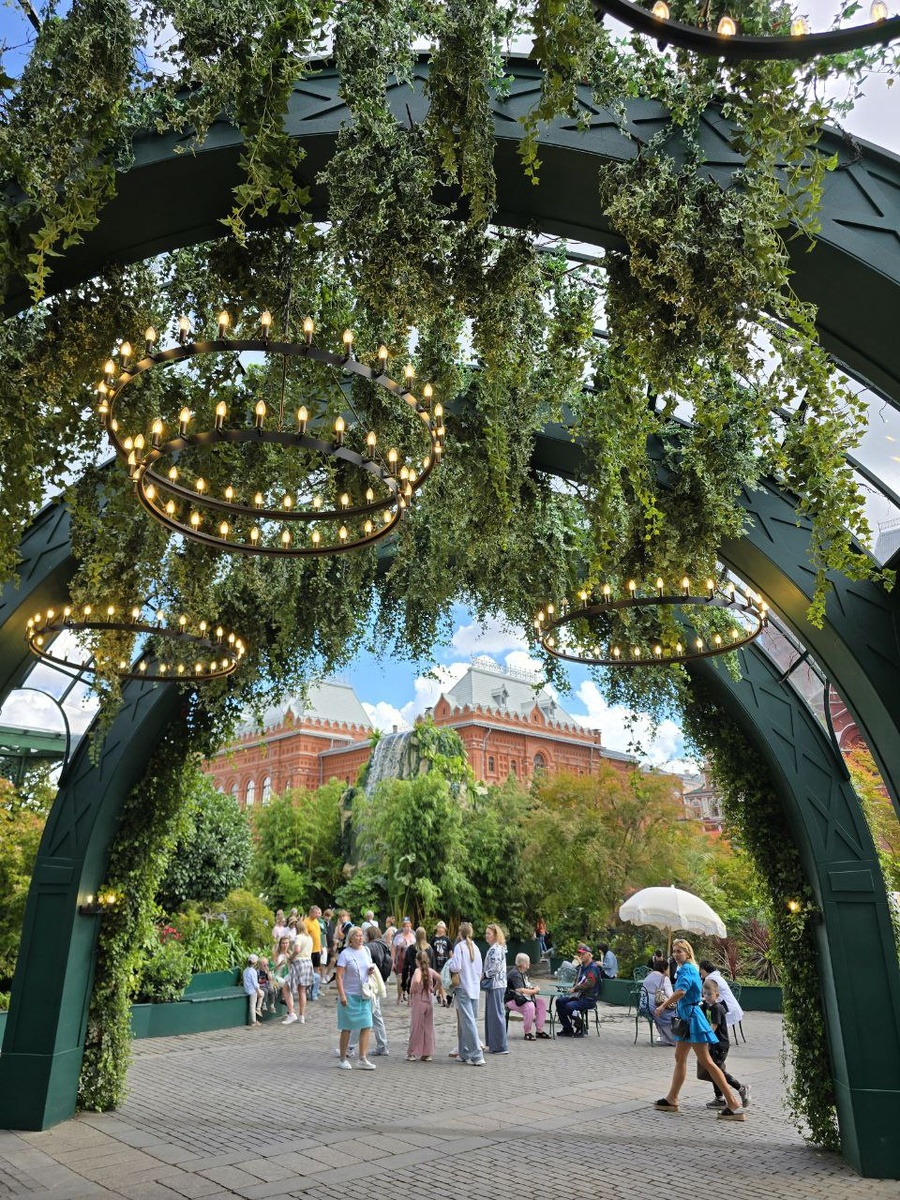 Тропический оазис с настоящим водопадом, деревьями с резными листьями, цветами и даже бамбуком. Для отдыха предусмотрены уютные местечки, кованые столики и плетёные диваны. Вечером площадь освещают люстры в виде цветочных гирлянд.
