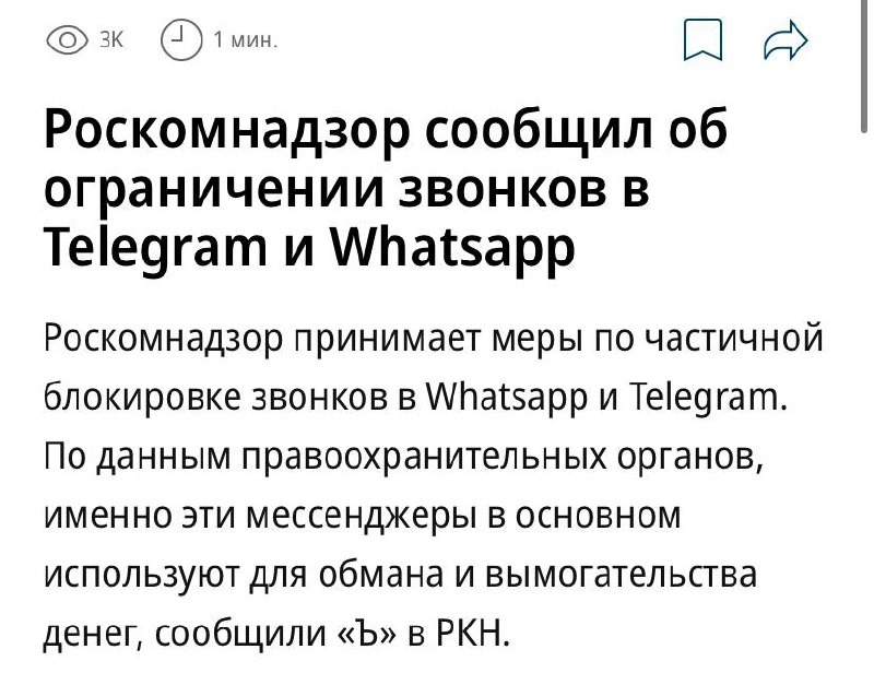 Буквально только что РКН объявил о блокировке звонков в Telegram и в WhatsApp