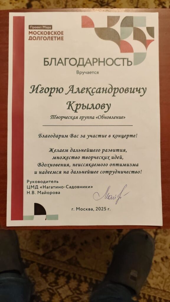 17 мая 2025 года в ЦМД «Нагатино-Садовники» в составе группы «Обновление» с декламацией своих стихов выступил академик ИАСК поэт Крылов Игорь Александрович, за что ЦМД «Нагатино-Садовники» выразили Игорю Александровичу свою благодарность.