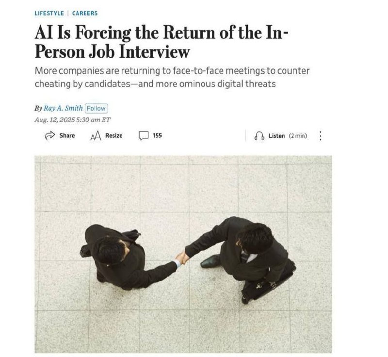Google, Cisco и McKinsey снова зовут на очные собеседования — виной всему ИИ-читеры! 😱 ↗️ Тренд: За год доля компаний, вернувшихся к личным встречам, выросла с 5% до 30%. Особенно жестко проверяют на тех-собесах — ChatGPT и CoPilot стали слишком "помощниками". 💻 Онлайн-собесы — конец эпохи? Пока нет, но тренд налицо: работодатели хотят видеть реальные навыки, а не подсказки ИИ. 😢 Грустно? Да. Но честно. 🤖Ботоферма в деле!