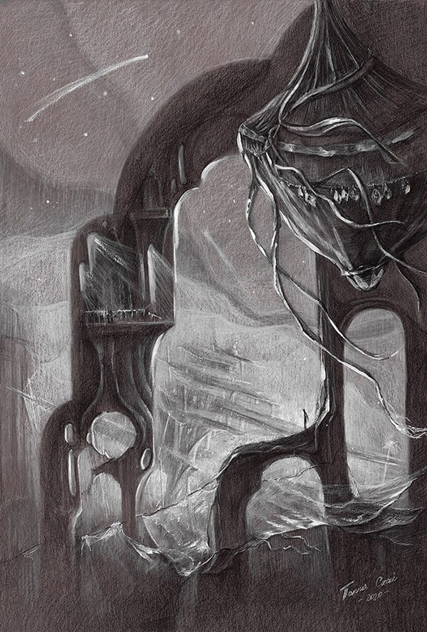 «Опустевший мир» — картина выполнена в технике монохромного рисунка с тонкой игрой света и тени