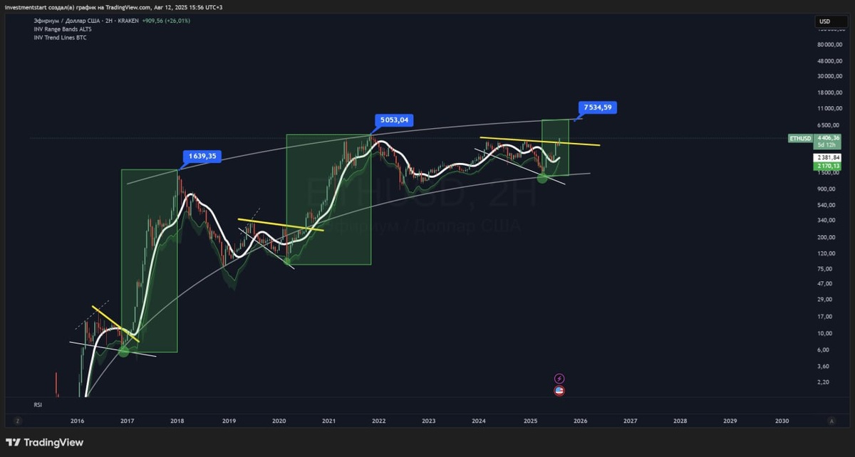 Только что вышли данные по инфляции в США, которые оказались лучше ожиданий. По итогу рынок снова взял разгонку из-за этой новости. Эфиру вообще осталось чуть меньше 7% до ATH. Он сейчас на тех значениях, на которых в последний раз был аж в 2021 году. Моя консервативная цель по нему — $5.000. Это то, куда мы с огромной вероятностью долетим в этом цикле. Но общая цель сохраняется в районе $7.000 🤝 Рост эфира — одна из важнейших стадий бычьего рынка, которая по итогу приводит к полноценному альтсезону: 1️⃣ Рост битка 2️⃣ Рост эфириума 3️⃣ Монеты с большой капитализацией начинают выстреливать 4️⃣ Так называемый сезон альткоинов Так что следим. Увидим ATH до конца августа?
