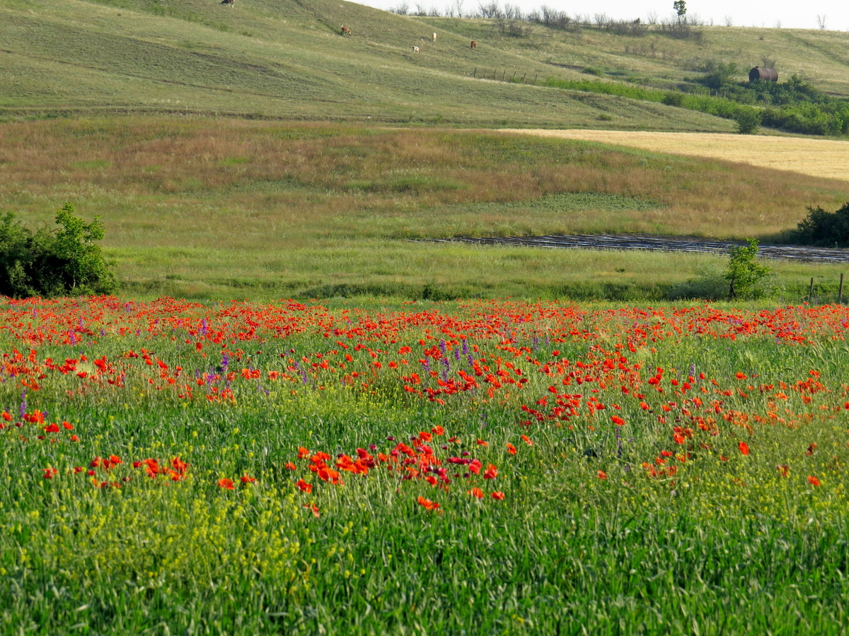 В одни из первых выходных июня, когда еще было время цветения маков, мы решили проехать через Белогорский район. Обычно в это время там все поля стоят красными. Вот уже и Белогорск,а маков все нет и нет. Нам пора сворачивать в Межгорье, так как гулять мы решили по притоку Бурульчи — реке Суат. И тут, за одним из сел, далеко в поле появился красный цвет! Ну хоть немножко маков, но мы встретили! Выскочив из машины, я разогналась бежать до середины поля! Но, остановилась. По полю шли ровненькие зелененькие полосочки чего то зернового. Не хорошо топтаться! Буду фотографировать издали. Главное, что маки есть! А по другую сторону дороги — осень. В начале июня! Нет, это просто озимые уже созрели. Но, смотрится очень интересно! С одной стороны молодая зелень будущих колосков, а с другой уже налитые спелостью колоски. Едем дальше. Оставив машину на краю села начали свою прогулку. Как приятно заходить в утренний лес, полный свежего и чистого воздуха! По обочинам цветут цветы. А мы идем себ