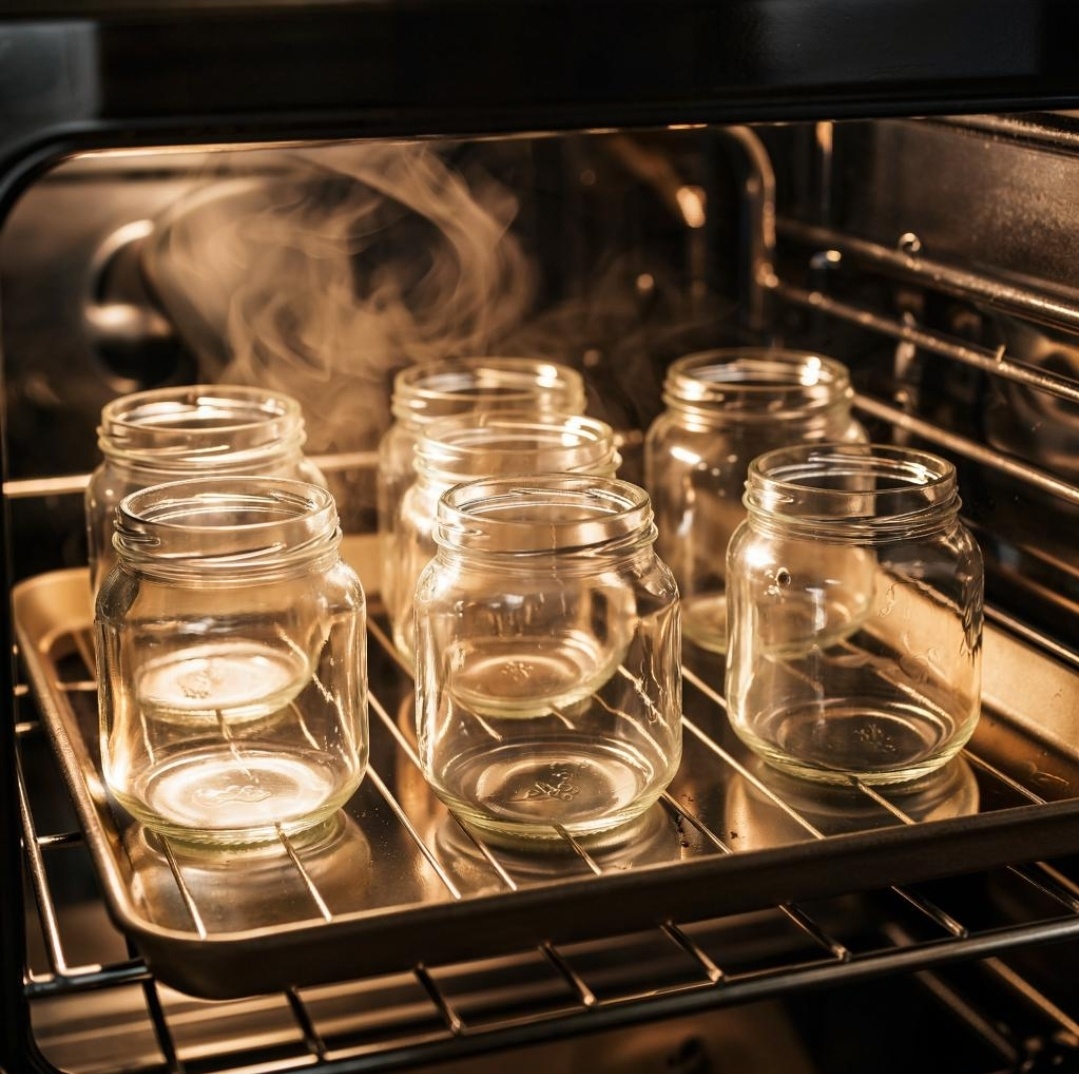 - Поставьте банки горлышком вниз на решетку духовки или горлышком вверх, если потом будете заполнять их в горячем виде.