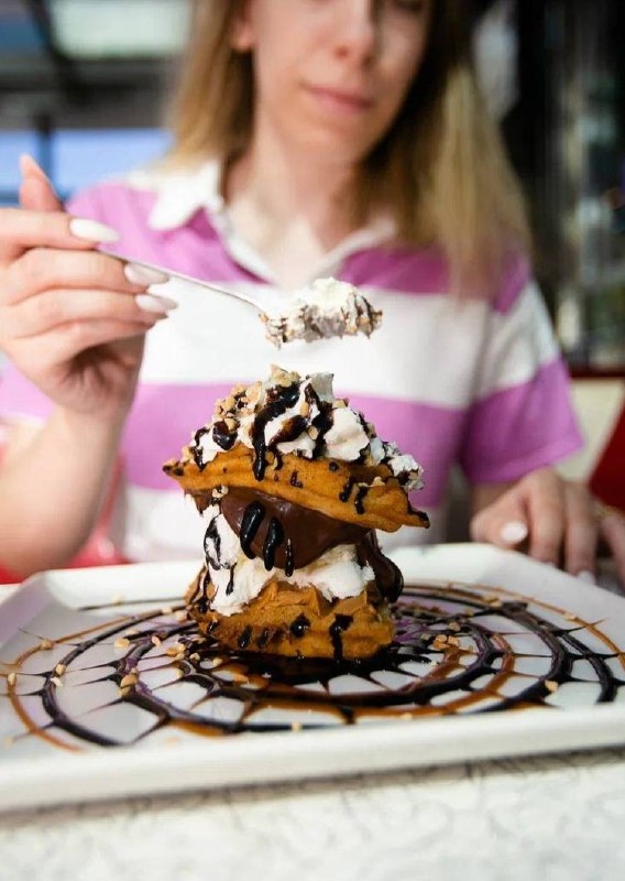 Невероятный сэндвич из Бельгийских вафель с шариком мороженого, нутеллой и арахисовым маслом.