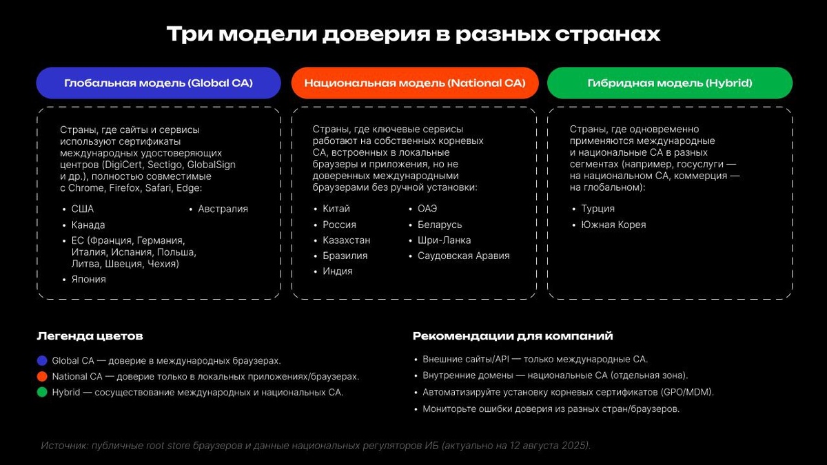🌍 Мировая карта доверия: кто контролирует корневые сертификаты? В последние годы растёт число стран, внедряющих национальные удостоверяющие центры (CA) для защиты веб-трафика. Первым примером стал Китай, а затем к нему присоединились Казахстан, Индия, Бразилия и другие. Если раньше на рынке доминировали несколько глобальных CA (DigiCert, Sectigo и др.), то теперь на карту легла геополитика. Как устроена глобальная система доверия 🔹Международная модель — в ЕС, США, Турции, Канаде публичные сервисы используют сертификаты глобальных CA, прошедших международный аудит. 🔹Национальная модель — в ряде стран (Китай, Казахстан, Индия, Бразилия) государственные и банковские сайты работают на национальных CA. В международных браузерах такие сайты часто отображаются с ошибкой ⚠️ «Недоверенный сертификат». Поэтому появляются локальные браузеры, где национальные CA встроены по умолчанию: 360 Browser и QQ Browser в Китае, Naver Whale в Южной Корее, корпоративные решения Яндекса в России. 🔹Росси