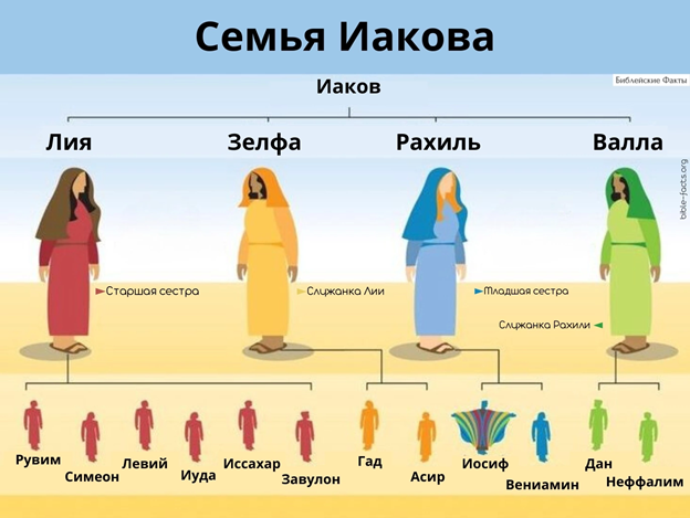 Да, у Иакова было две жены – родные сёстры Лия и Рахиль, которые приходились Иакову двоюродными сёстрами. Обе сестры соревновались друг с другом, стараясь родить мужу как можно больше детей, поэтому звали на помощь своих служанок, чтобы они тоже рожали от Иакова. Таким образом от двух жён и двух служанок у Иакова родилось 12 сыновей и только одна последняя младшая дочь Дина.