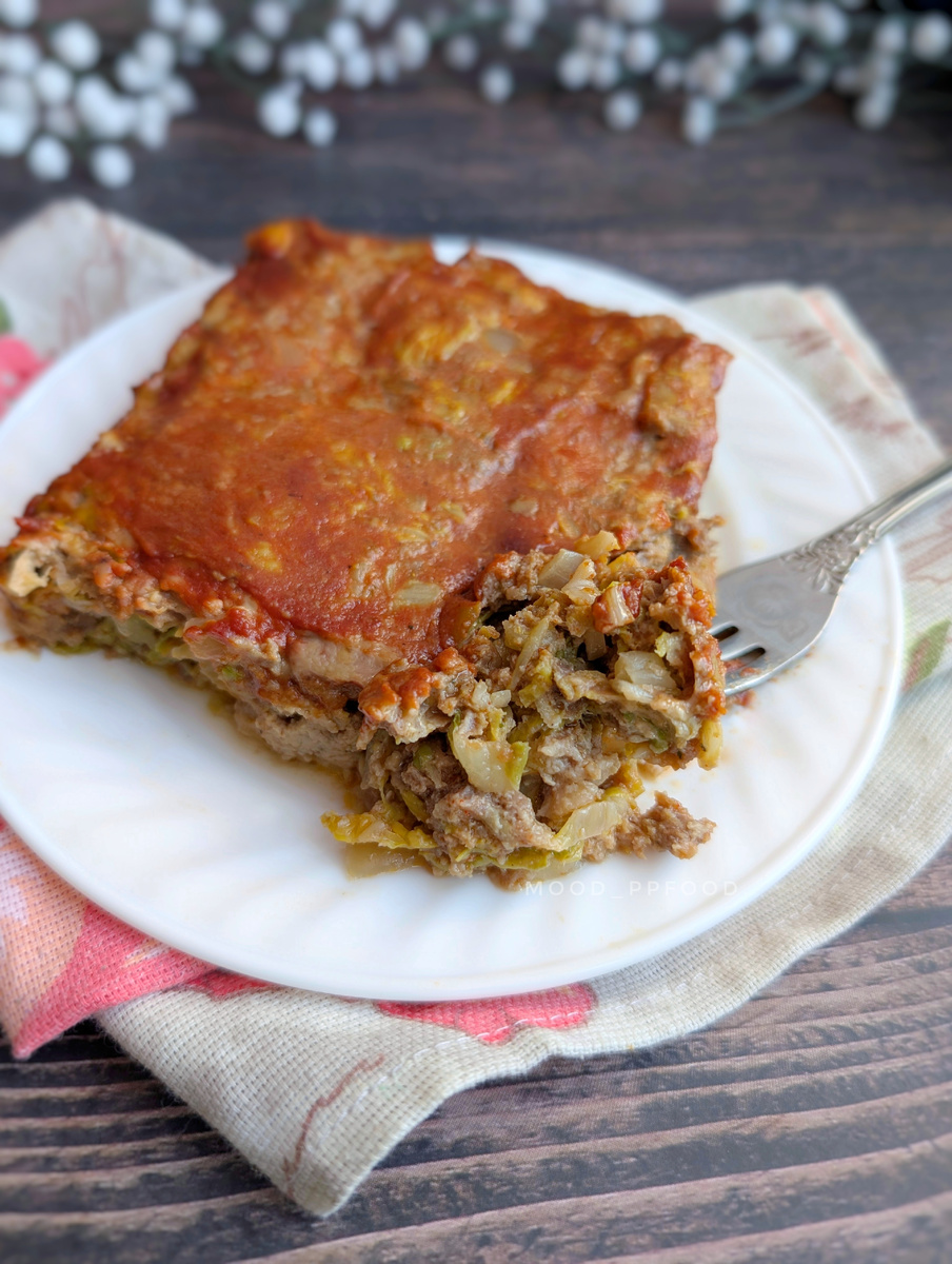 Фарш говяжий - 200 г. Пекинская капуста - 200 г. Лук репчатый - 50 г. Яйцо куриное - 1 шт. Вода - 100 г. для тушения капусты + 15 г. в томатную пасту. Томатная паста - 30 г. Масло д/жарки - 5 г. Копчёная паприка - 1 ч.л. Карри - 1/2 ч.л. Соль, перец. 1️⃣ Шинкуем пекинскую капусту и нарезаем кубиком лук. 2️⃣ Перекладываем в сковороду, наливаем 100 г. воды, накрываем крышкой и тушим до выпаривания жидкости. Остужаем. 2️⃣ В фарш добавляем: одно яйцо, остывшую капусту, соль, перец и чайную ложку паприки. Хорошенько перемешиваем. 3️⃣ В томатную пасту добавляем воды (изначально она у меня была густая, если у вас жидкая, то воду можно и пропустить). А также половину чайной ложки карри. Перемешиваем. 4️⃣ Перекладываем мясную смесь в форму для выпечки, сверху смазываем томатной пастой. 5️⃣ Выпекаем при 180° 45-50 минут. Готово, приятного аппетита 😋