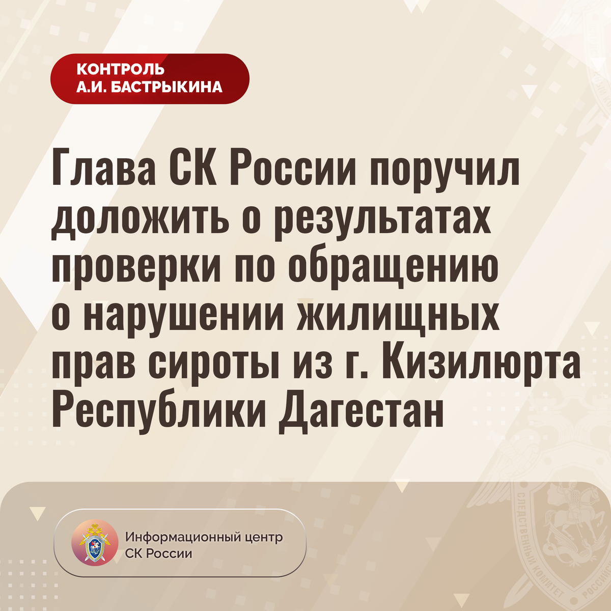 Глава СК России поручил доложить о результатах проверки по обращению о нарушении жилищных прав сироты из г. Кизилюрта Республики Дагестан