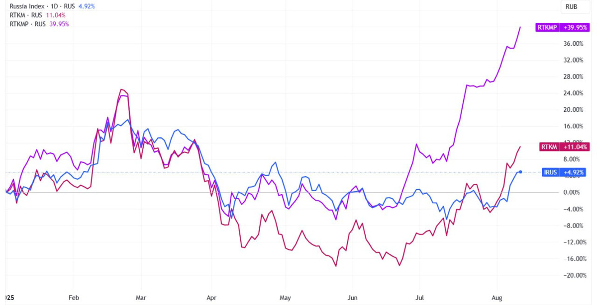 #отчетность $RTKMP Ростелеком - отчетность и ралли в акциях Прим: цены и график приведены ДО дивидендного гэпа. Ростелеком ожидаемо отчитался за 6 месяцев 2025: продолжается размеренный рост, но чистая прибыль ушла на процентные расходы. 🔹 Выручка +11%, EBITDA +6%, ЧП -54% 🔹 Маржинальность EBITDA 39% 🔹 ЧД/EBITDA остался на уровне 2.4 🔹 P/E 68, EV/EBITDA 3.1 Каких-то прорывов на уровне материнской компании нет. Хотя дочерние компании, которые прочат на IPO и растут быстрыми темпами - в общей выручке и прибыли их доля пока слишком мала. Например, Солар отчитался о росте выручки в 1 полугодии на 40% до 8.5 млрд., но вся выручка Ростелекома за этот период - 393 млрд. Тем временем акции компании значительно обгоняют рынок (см.скриншот), в частности привилегированные акции с начала года выросли на 40%. Поскольку я держу именно префы, хочется понять, есть ли фундаментал у этого роста? Ростелеком, как и все компании с высокой долговой нагрузкой - бенефициар снижения ставки. Однако