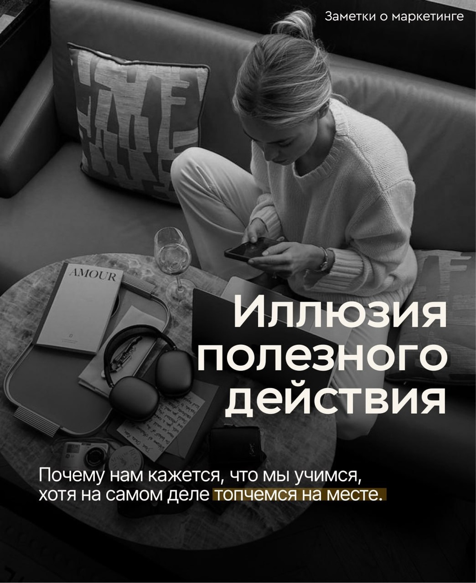Иллюзия полезного действия Мы все попадали в эту ловушку: бесконечно читаем статьи, слушаем подкасты, сохраняем вебинары «на потом» — и ощущаем, будто движемся вперёд. На самом деле мы получаем не результат, а ощущение прогресса. Психологи называют это иллюзией полезного действия. Почему это происходит? 🟠Потому что мозг любит быстрый дофамин: мы «как будто» уже сделали шаг к цели, хотя не применили ни одного знания. ⬆️В этом посте разберём: — что такое иллюзия полезного действия, — как она маскируется под обучение и развитие, — почему это опасно, — и что делать, чтобы вырваться из этой петли. ❤️ — если замечали за собой (не стесняемся, я тоже за собой это замечала) 👑 Заметки о маркетинге