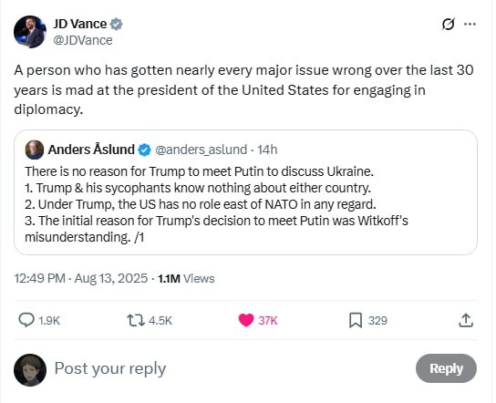 Вице-президент США осудил шведского русофоба-экономиста Андерса Ослунда за критику переговоров в Аляске. К слову, в 1990-е Ослунд был советником премьер-министра Егора Гайдара. «Человек, который ошибался насчет почти каждого важного вопроса за последние 30 лет, злится на президента США за его участие в дипломатии». Вы лучше на Зеленского так надавите, если не хотите, чтобы все сорвалось. 👍 БайБайден. Подписаться