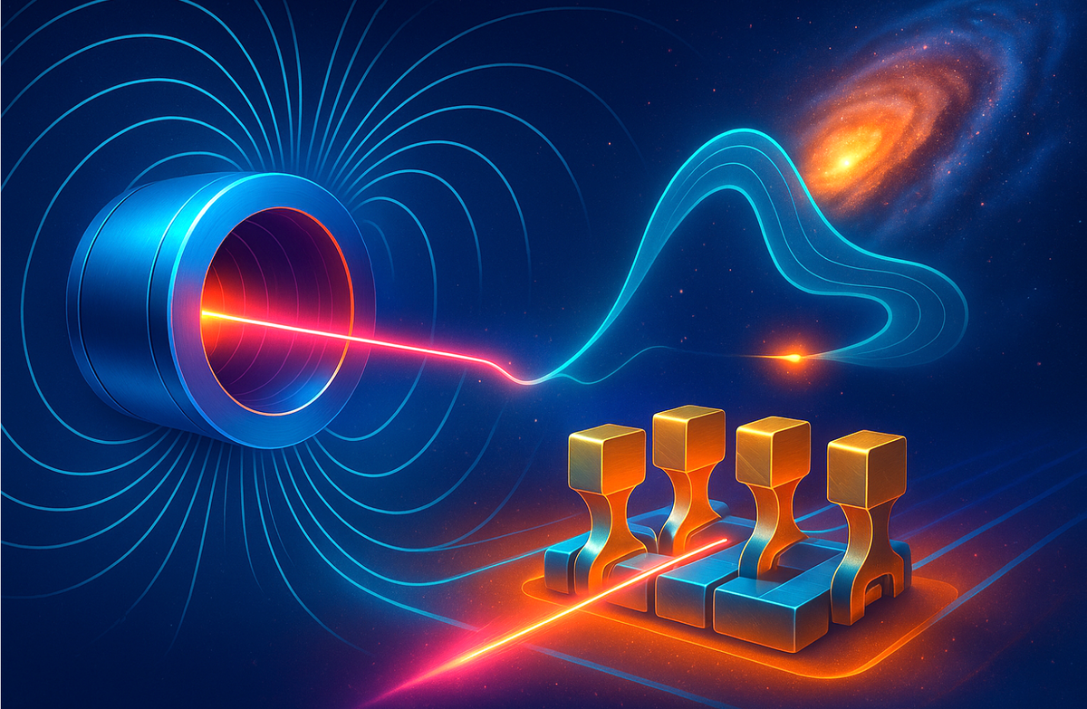 Российские физики предложили способ регистрировать сверхслабые вспышки света, которые могут возникать при спонтанном превращении аксионов — гипотетических сверхлёгких частиц тёмной материи — в фотоны в сильном магнитном поле. Подход основан на использовании квантовых однофотонных детекторов и описан в статье в журнале Physical Review D. Проект детектора CASH разработан группой ведущих российских физиков и космологов под руководством Андрея Панкратова, ведущего научного сотрудника НГТУ. Установка относится к классу галоскопов — приборов, которые ищут следы тёмной материи по её возможному преобразованию в фотоны в присутствии мощного магнитного поля. Главная идея: при правильно «настроенном» резонаторе фотоны, возникающие из аксионов в заданном диапазоне масс, можно улавливать и подсчитывать. Для этого нужны детекторы с экстремально низким уровнем собственных шумов. Расчёты показывают, что такая схема способна за один год наблюдений подтвердить либо исключить существование аксионов в диа