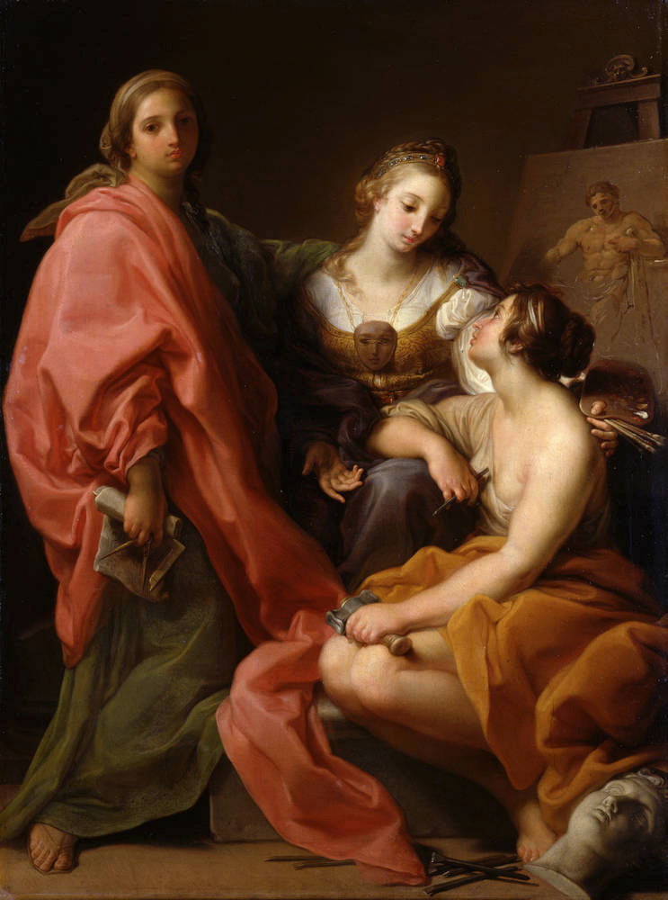 Персонификация различных видов искусств в виде прекрасных молодых женщин была популярной темой в творчестве итальянского художника Помпео Джироламо Батони (1708–1787), к которой он неоднократно возвращался на протяжении своей карьеры. В начале карьеры он был особенно очарован привлекательными изображениями музыкальных, литературных и изобразительных искусств, которые он представлял в различных обликах, следуя описаниям и атрибутам, данным в «Иконологии» Чезаре Рипы, ведущем иконографическом справочнике для европейских художников со времен Контрреформации. Около 1740 года Батони создал ряд аллегорических композиций, изображающих виды искусств, которые, по-видимому, были инициированы его ранними покровителями из знатных луккских семей, такими как Франческо Конти. Одной из самых ранних и оригинальных является «Живопись, скульптура и архитектура» (ок. 1740 г.; Галерея старых мастеров, Дрезден). Батони лучше всего проявлял себя именно в картинах, которые требуют показа грации и обаяния, и