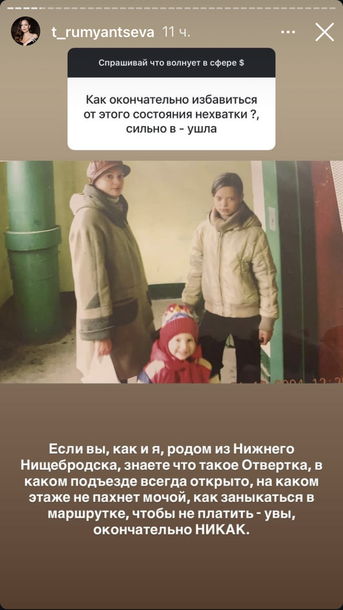 А по факту никуда не вышли; так и остались в обоссаном подъезде, раз она так любит постоянно ссылаться на своё бедное детство (как и у большинства в 90е). Так и осталась в травмах маршруток. Хотя могла бы уже давно проработать этот вопрос.