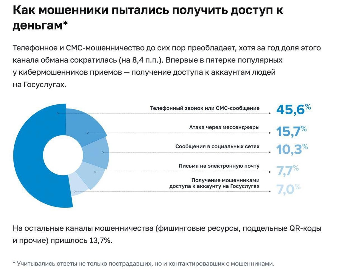 Ксения Собчак назвала странным решение властей о запрете голосовых вызовов в Telegram и WhatsApp*, напомнив, что, по данным ЦБ РФ за 2024 год, лидерами среди каналов мошенничества остаются обычные телефонные звонки и СМС — 45% всех случаев. А доля атак через мессенджеры почти втрое ниже — 15,7%. Впервые в топ-5 способов обмана также вошёл доступ к аккаунтам на «Госуслугах».