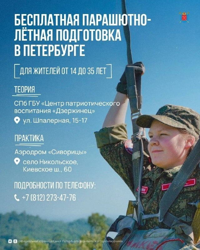 🪂Петербуржцы могут бесплатно освоить парашютный спорт. В «Центре патриотического воспитания «Дзержинец» проводится подготовка для жителей от 14 до 35 лет. Участники изучат теорию в парашютном классе, а практические навыки отработают на аэродроме «Сиворицы». Узнать расписание и познакомиться со специалистами центра можно на официальном сайте. На оставшиеся вопросы ответят по телефону: +7 (812) 273-47-76.
