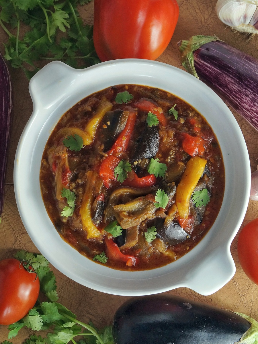 Аджапсандали 🍆🍅🌶 Конечно, как и практически любое кавказское блюдо, аджапсандали лучше готовить на мангале, но и в домашних условиях получается очень вкусно! Ингредиенты: ▫️ Баклажаны 1 кг; ▫️ Болгарский красный перец 0,5 кг; ▫️ Помидоры 0,5 кг; ▫️ Лук репчатый 300 г; ▫️ Острый перец по вкусу (не обязательно); ▫️ Чеснок 4-5 зубчика; ▫️ Растительное масло для жарки; ▫️ Кинза пучок; ▫️ Базилик свежий (по желанию); ▫️ Соль, перец по вкусу. Процесс приготовления: Баклажаны помыть и заранее порезать достаточно крупными кусочками (чем мельче кусочки, тем больше итог будет похож на кашу). Пересыпать солью и оставить на 30 минут, чтобы ушла горечь. На большой сковороде с толстым дном или в воке обжарить порезанный полукольцами лук. Добавить к луку баклажаны, обжарить до полуготовности, затем всыпать порезанный полосками болгарский перец. Помидоры обдать кипятком, снять шкурку и мелко порезать (можно потереть на тёрке или измельчить блендером), добавить к овощам. Посолить, поперчить
