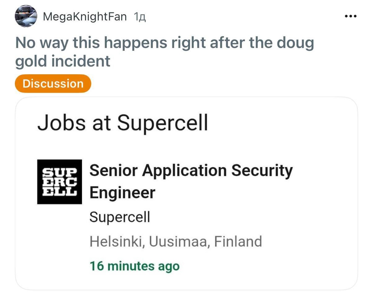 😄 Кому-то досталось за баг... Сразу после вчерашнего бага Supercell выкатили вакансию на работу на должность старшего инженера по безопасности приложений. Вряд ли кого-то уволили за это, но кто знает… ✅Новости по Clash Royale - ТЫК Мир Supercell. Подписаться