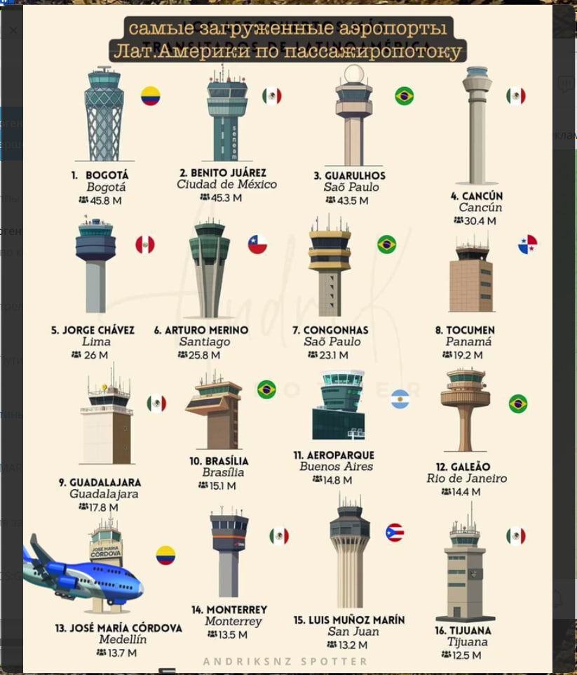 Рейтинг самых загруженных аэропортов ЛатАм по пассажиропотоку (в млн. чел/год). Топ-5: 1. Богота, Колумбия – 45,8 млн 2. Мехико (Бенито Хуарес), Мексика – 45,3 млн 3. Сан-Паулу (Гуарульос), Бразилия – 43,5 млн 4. Канкун, Мексика – 30,4 млн 5. Лима (Хорхе Чавес), Перу – 26 млн Дальше идут аэропорты Сантьяго, Конгоньяс, Токумен, Гвадалахара, Бразилиа, Буэнос-Айрес 🇦🇷 (Aeroparque), Галейан, Медельин, Монтеррей, Сан-Хуан и Тихуана.