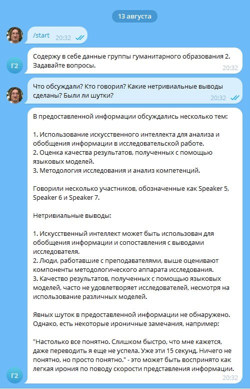 По итогам ИИ-форума в Тюмени были опубликованы боты, которые в качестве базы содержат обсуждения по трекам. Кажется, что при выжимке теряются нюансы )) Но в целом, это похоже на новый стандарт при публикации материалов. Но я бы кнопки со стандартными запросами таки добавил бы при старте. Ну и спикеров нужно было бы текстом описать. Telegram-боты: ➡️ Концептуальный трек Группа «Гуманитарное образование» №1 Группа «Гуманитарное образование» №2 Группа «Инженерное образование» Группа «Предпринимательское образование»
