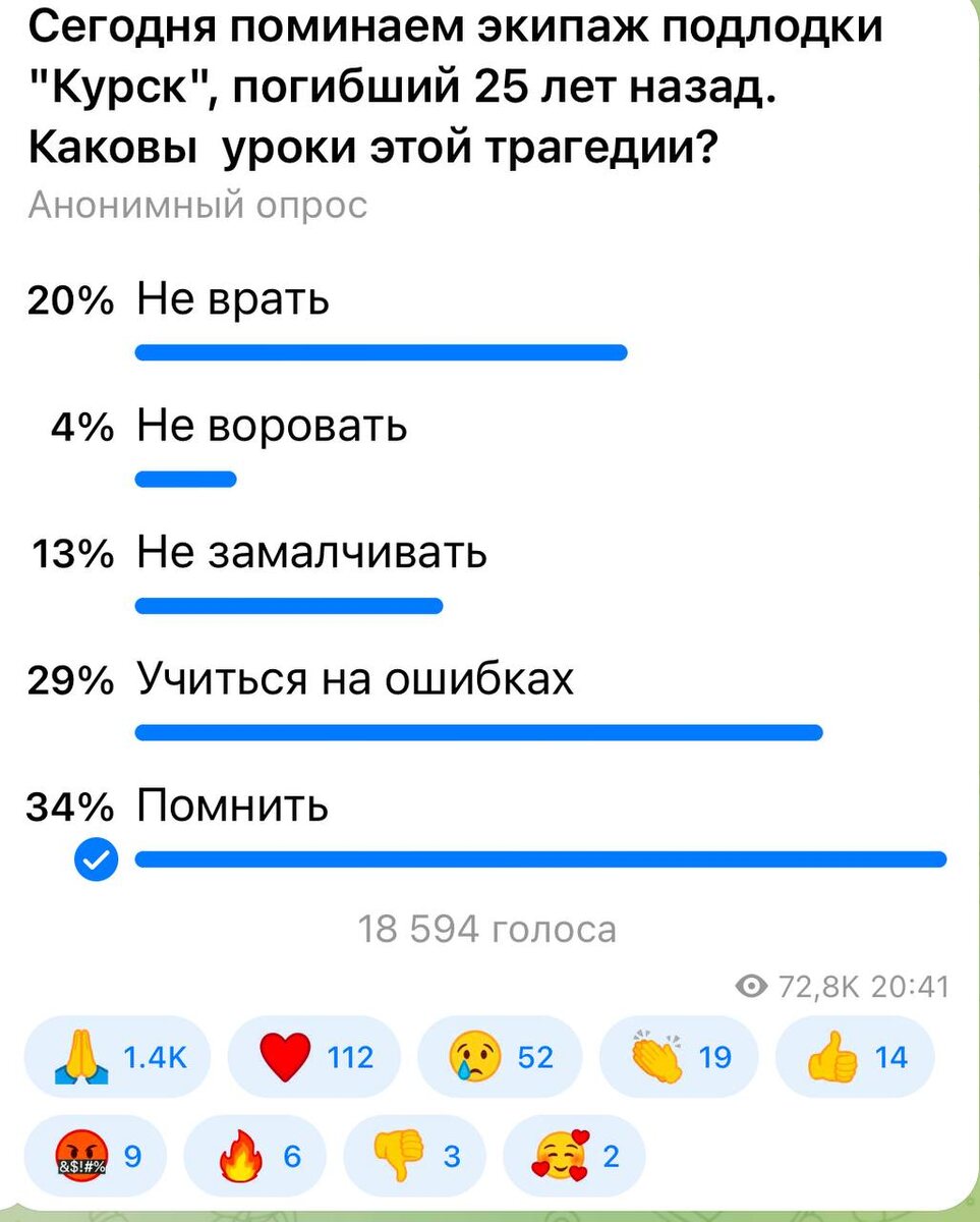 ⚡️⚡️⚡️ 34 процента подписчиков считают, что нам нужно помнить об этой трагедии. А выводы из тогдашних ошибок мы, хочется надеяться, уже сделали. Наш стратегический подплав регулярно пополняется новыми атомоходами. Морская компонента нашей ядерной триады продолжает жить и развиваться.