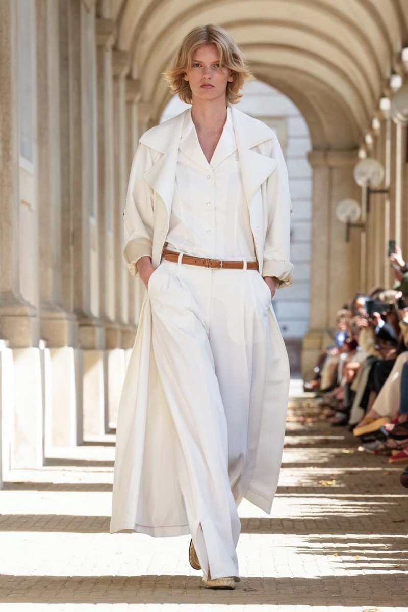 На фоне королевских конюшен, построенных в 1740 году в ансамбле барочного дворца Кристиана IV, развернулся показ. Место, пропитанное историей, стало идеальным отражением характера коллекции — величие без громких жестов. Одежда шептала, а не кричала. Она напоминала о ритуалах дома, о мягком утреннем свете, о неторопливых вечерах в старинных летних домах. Контраст лёгких хлопковых простыней на ветру и прочного обветренного камня лёг в основу стилистики. Этот баланс мягкости и структуры